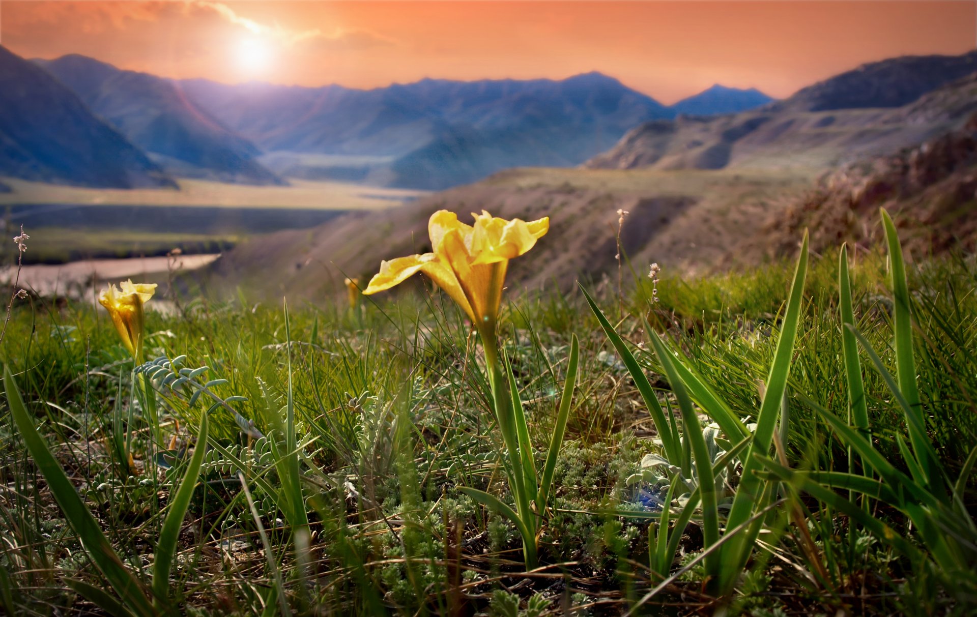 Жёлтый цветок, молодая зелёная трава на фоне гор