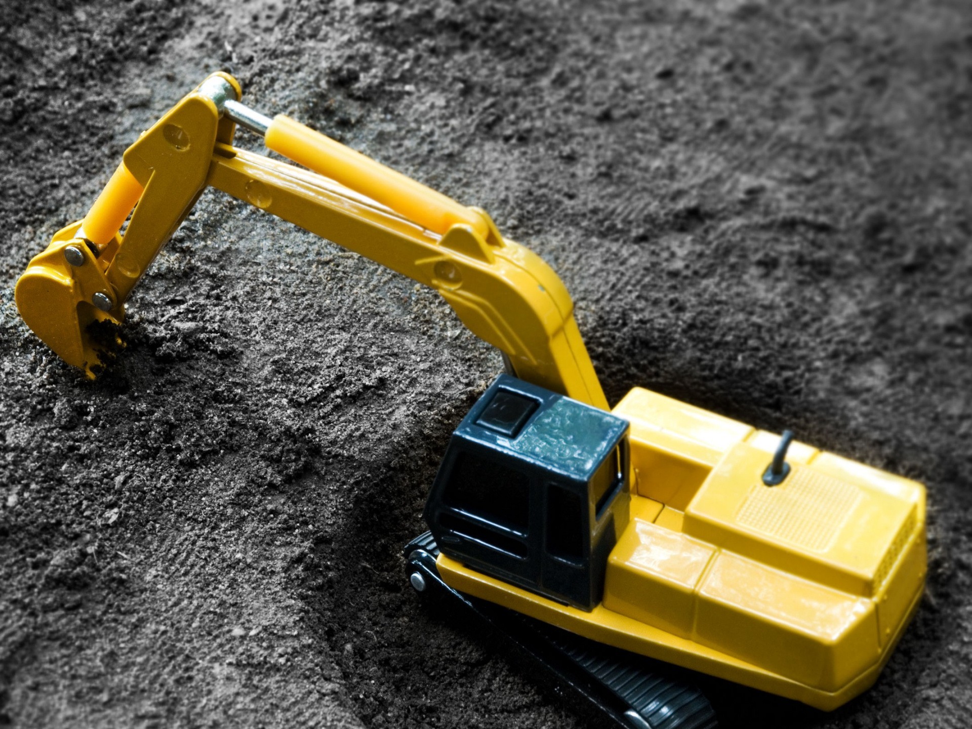 Чёрный сверкающий автомобиль и жёлтый экскаватор