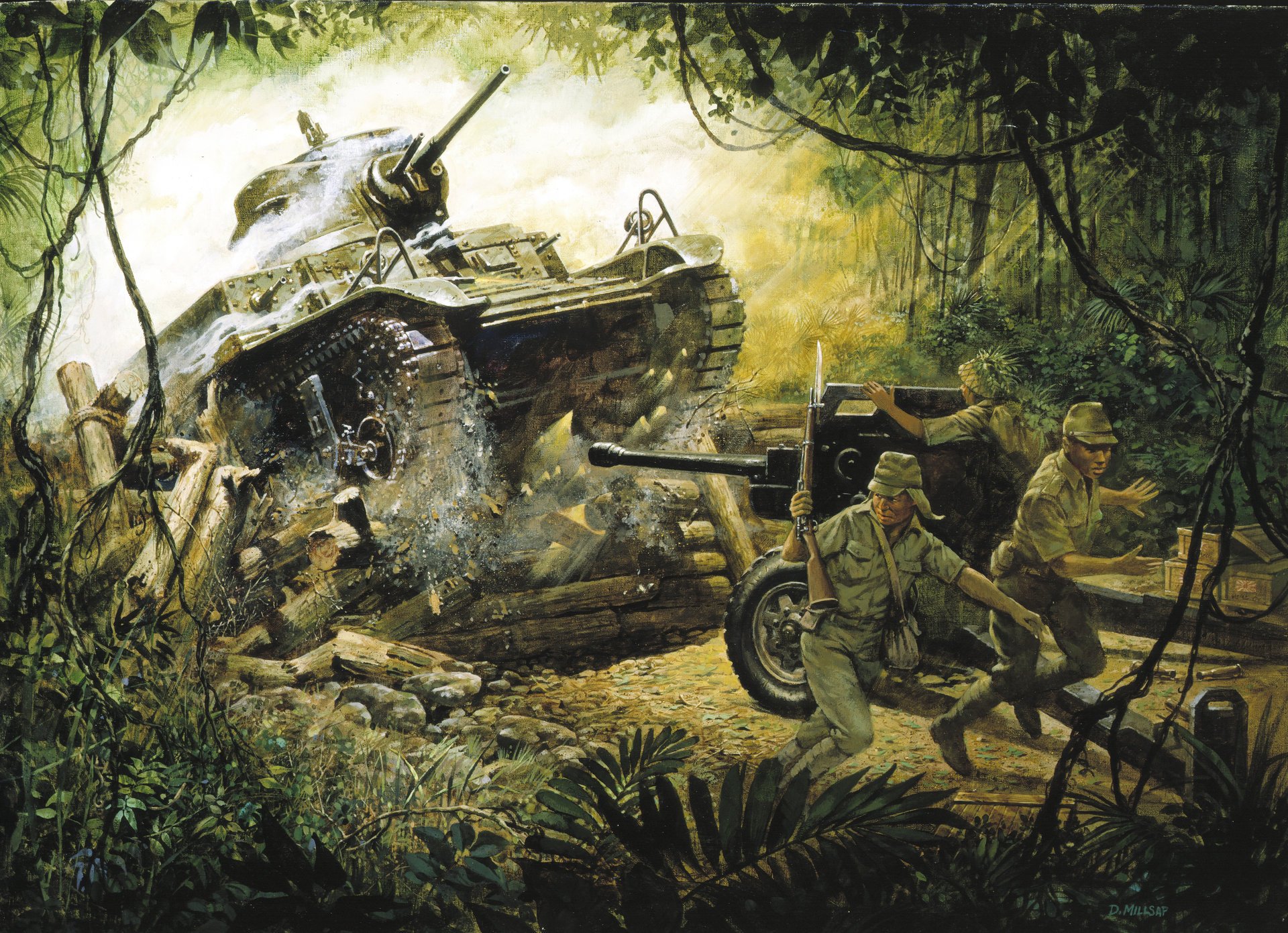 Японцы на войне среди зарослей с танком и пушкой