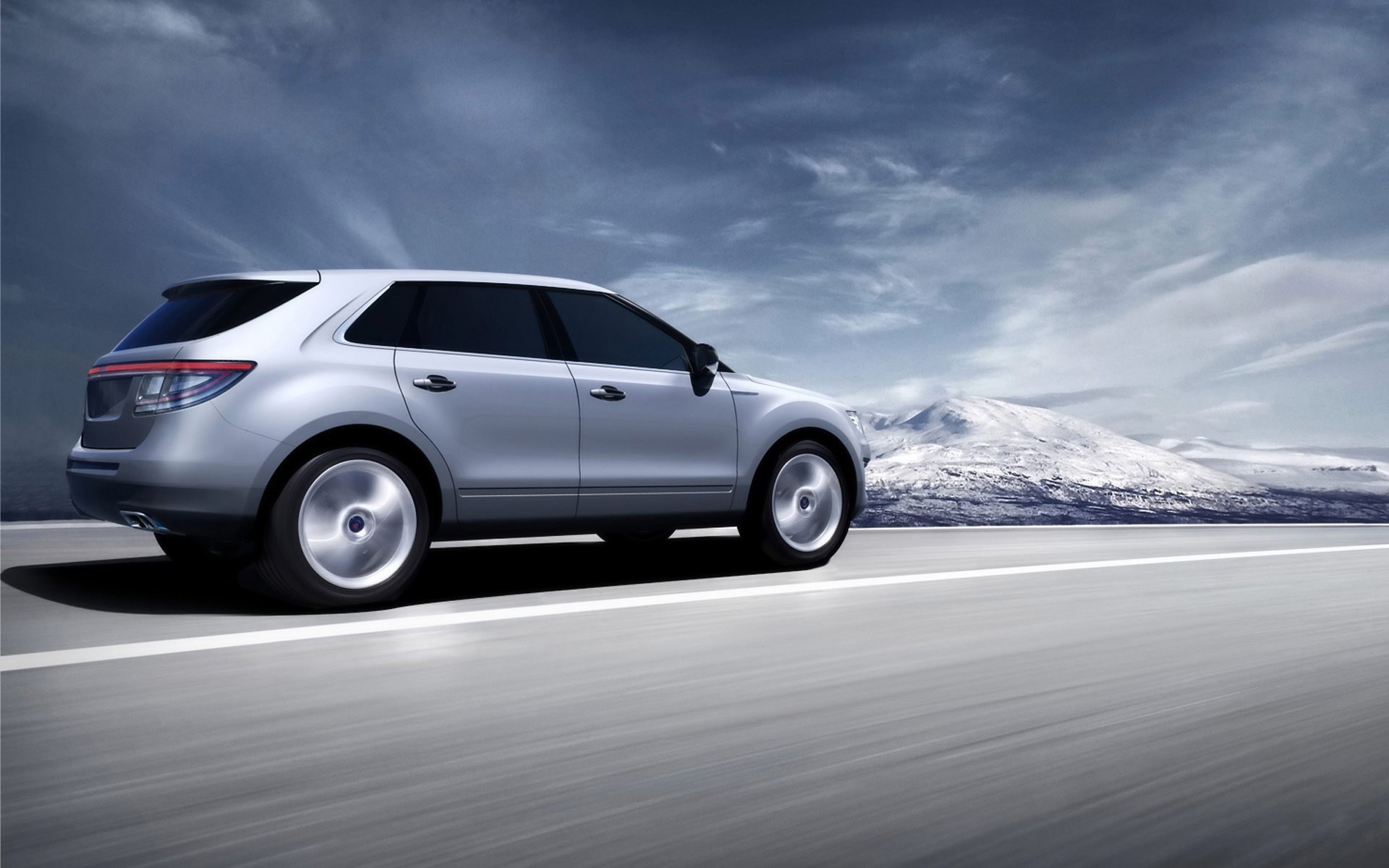 Saab 9-4x с высокой скоростью проезжает горную дорогу