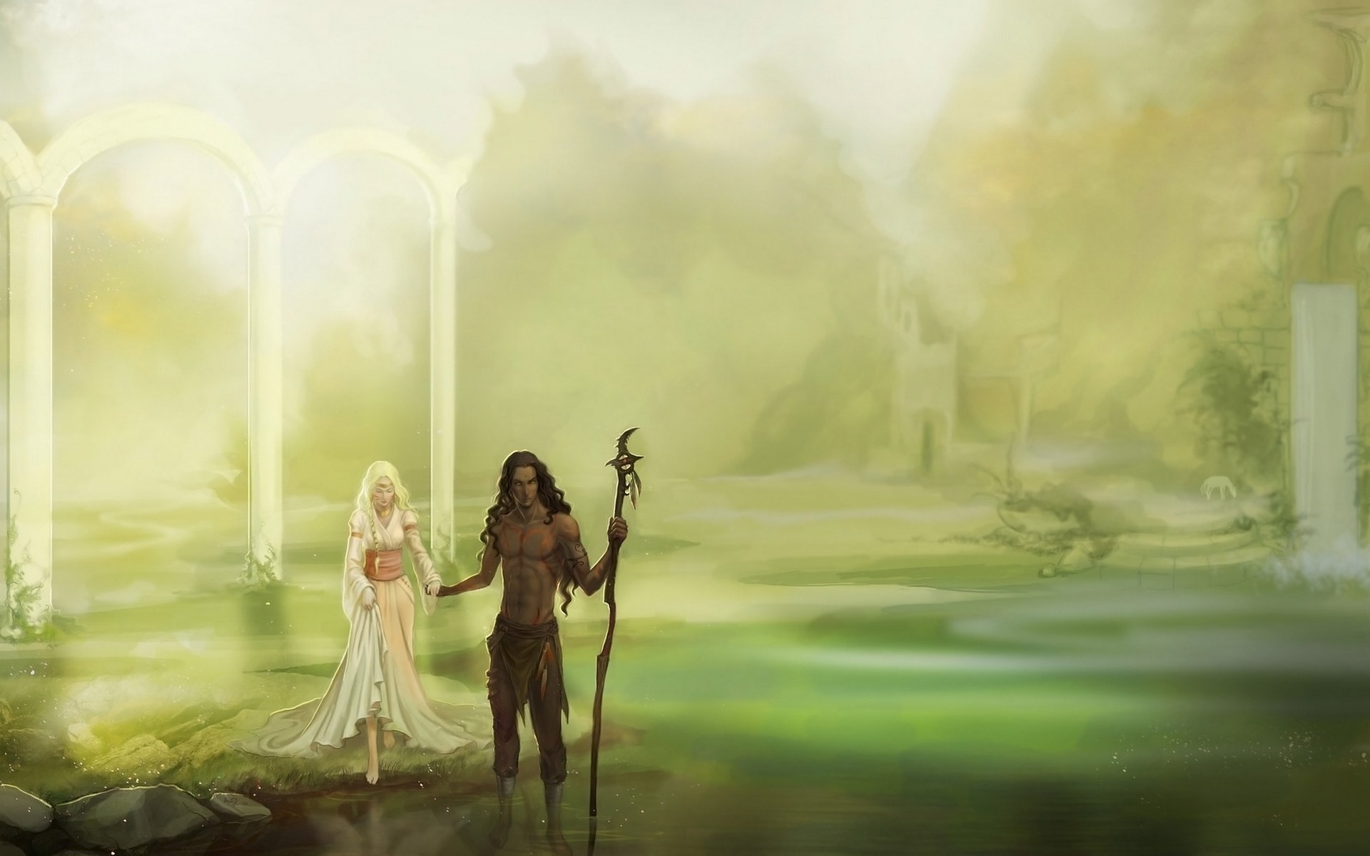 Красивая сказочная пара сидит под деревом на фоне зелёного пейзажа