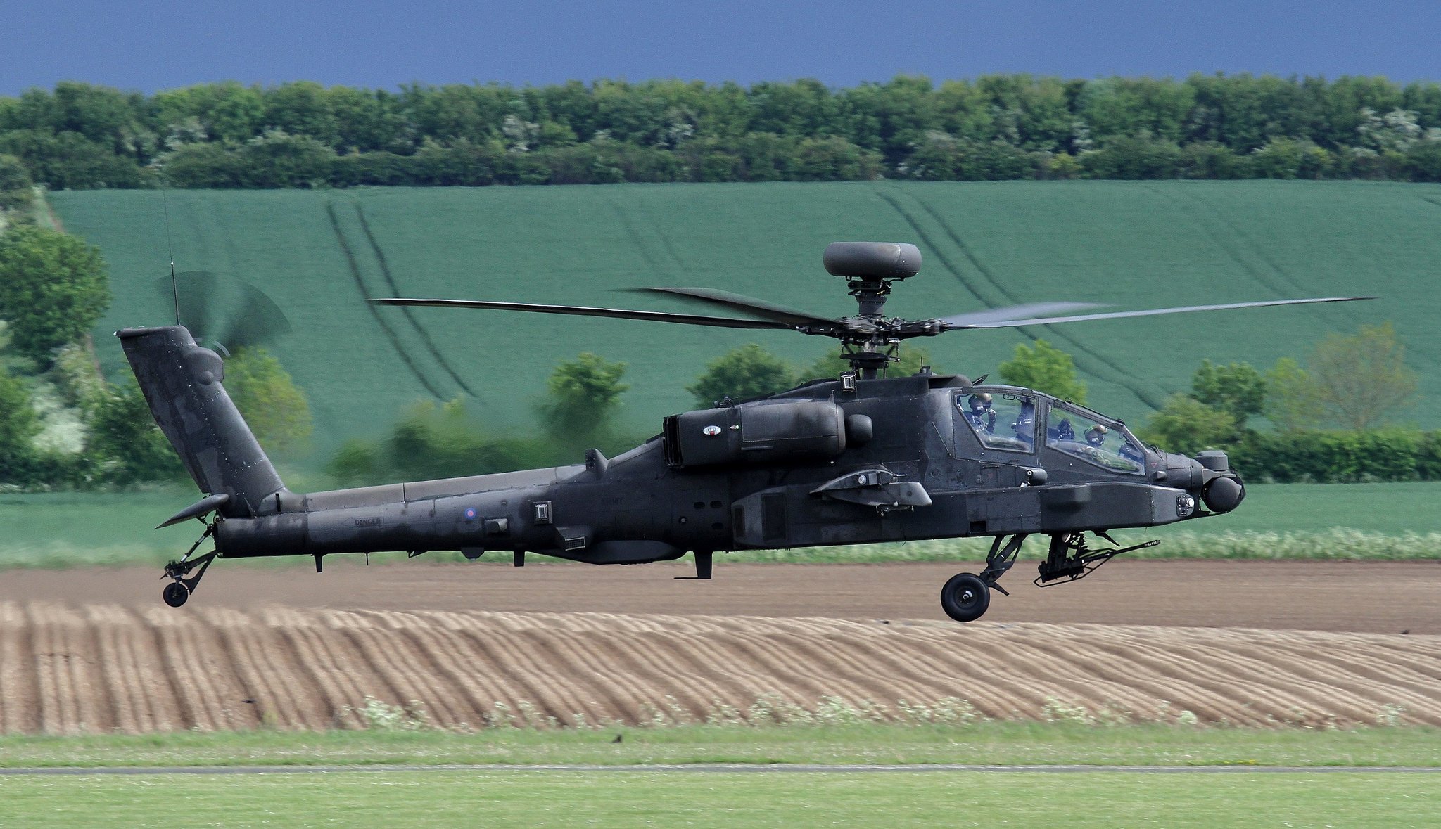 Вертолет apache ah-64 пролетает над полями