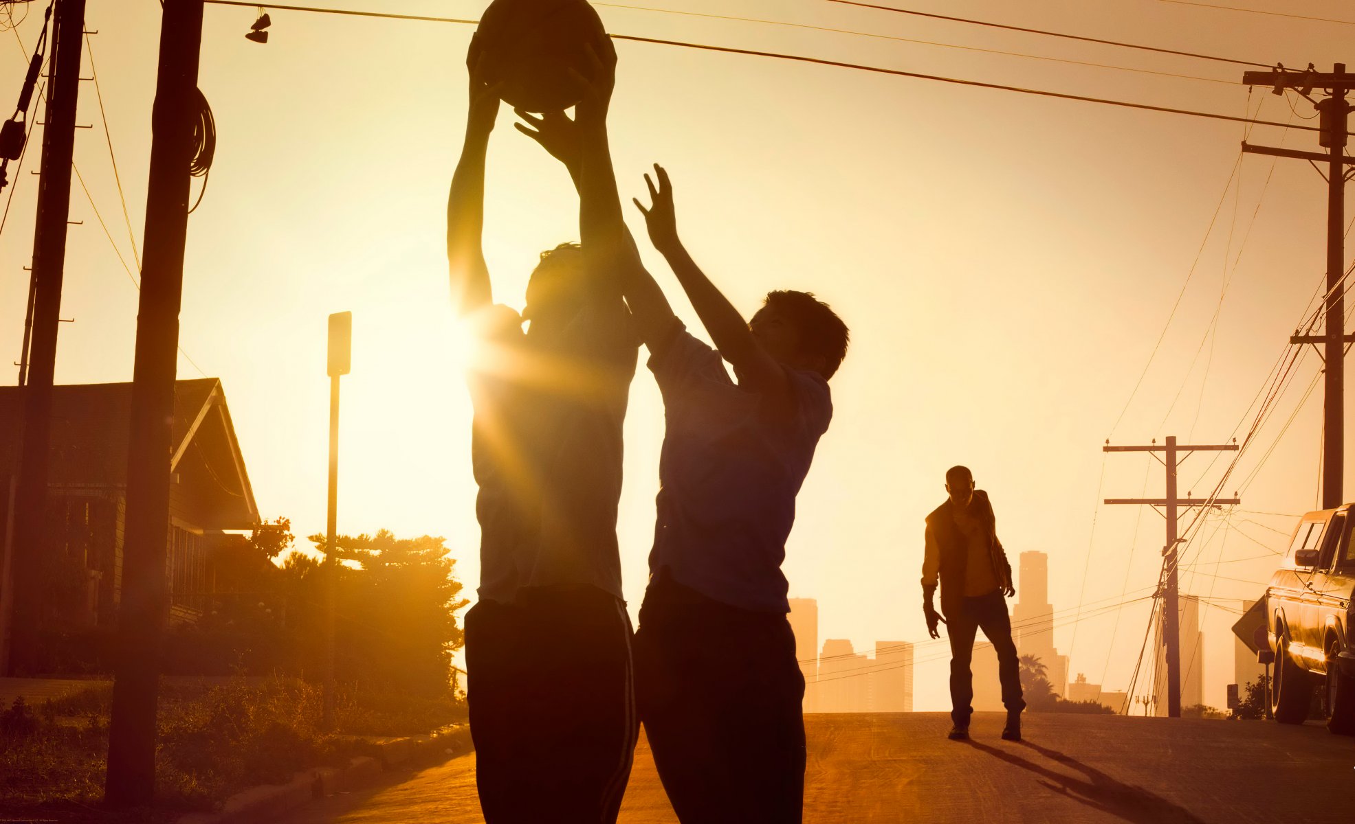 Постер из сериала "Бойтесь ходячих мертвецов" с играющими в баскетбол мальчиками.