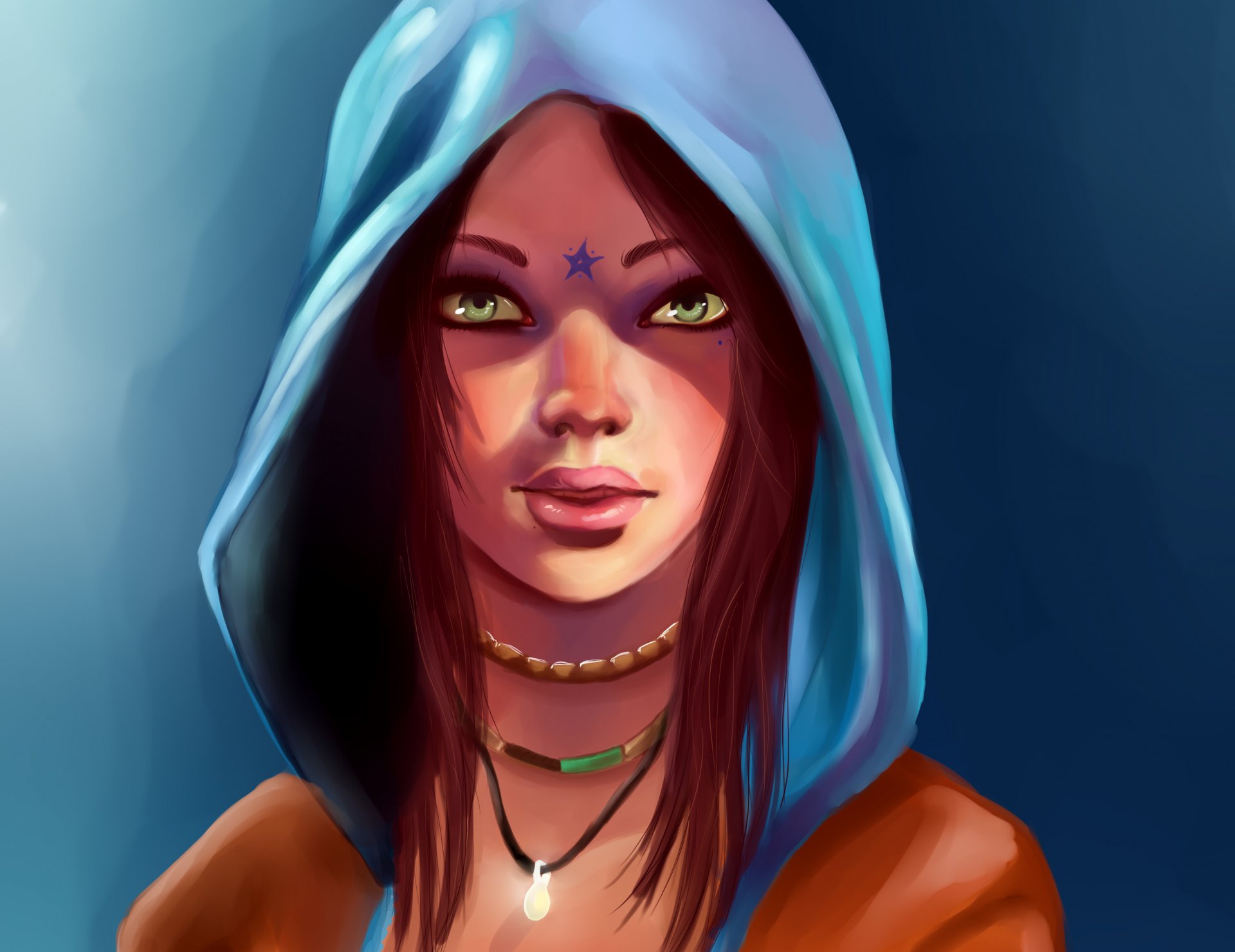 Зеленоглазая девушка в голубом капюшоне и синей звёздочкой во лбу