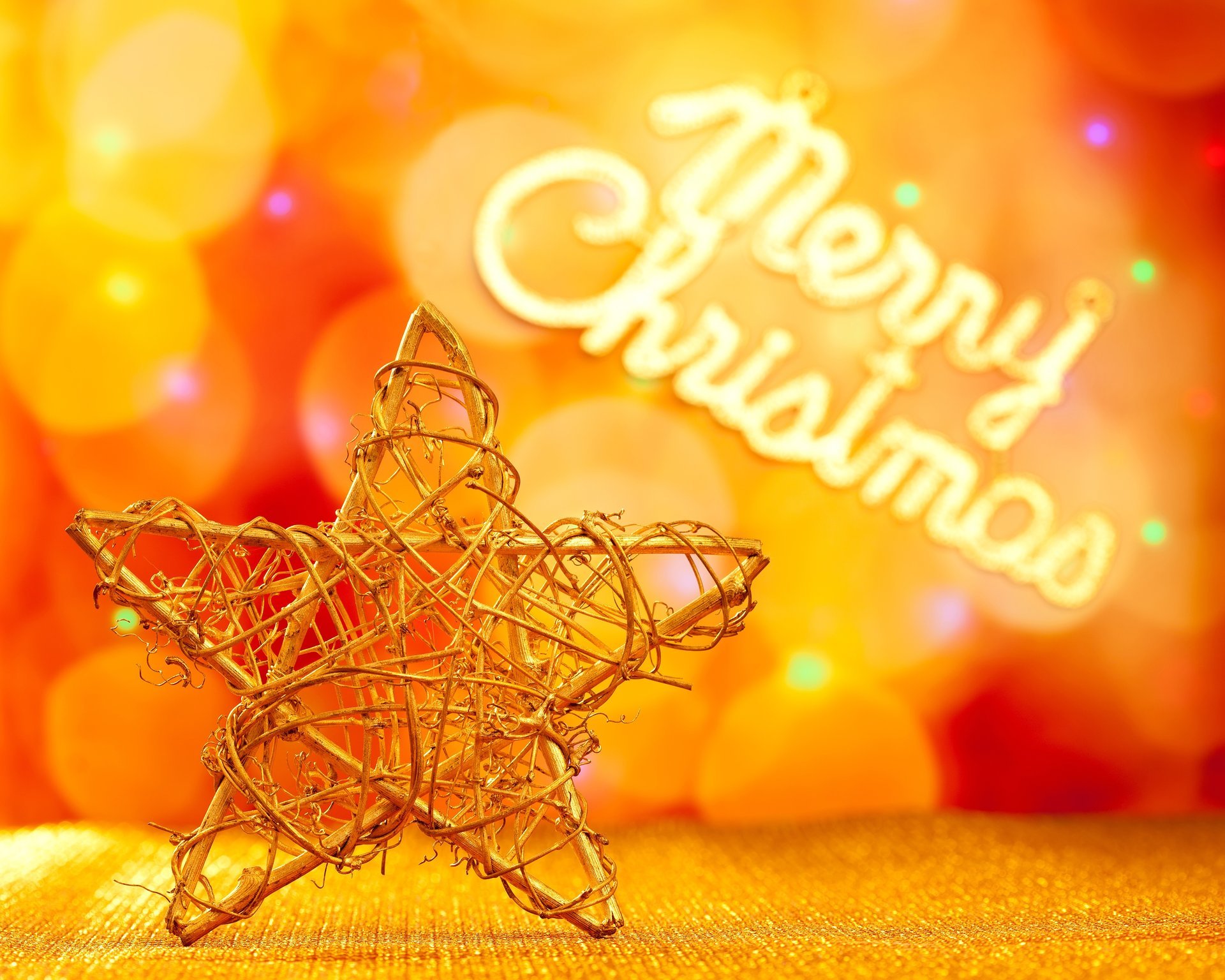 Металлическая елочная игрушка-звезда на фоне боке и надписи Merry Christmas