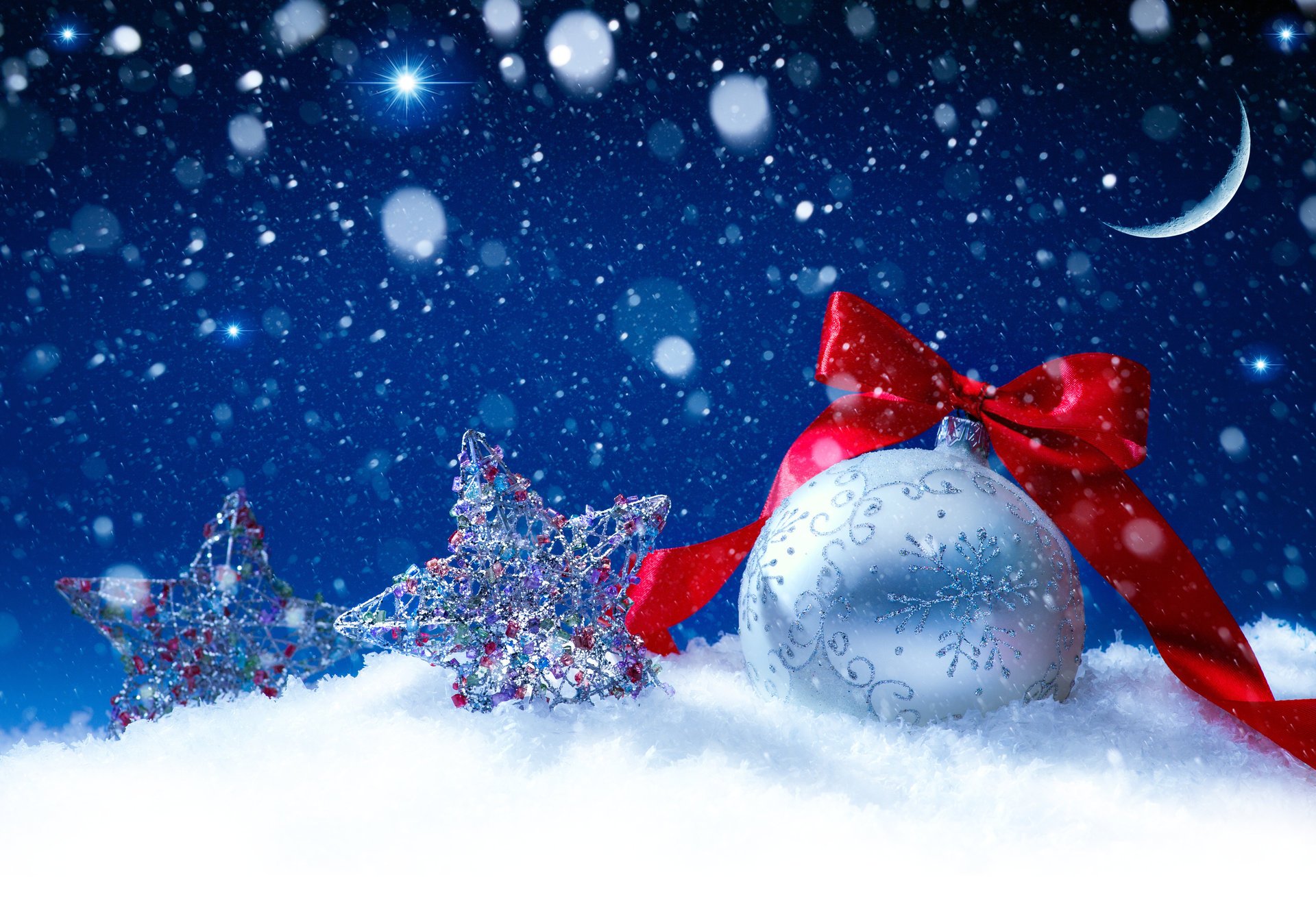 Новогодние шарики на фоне со снежинками