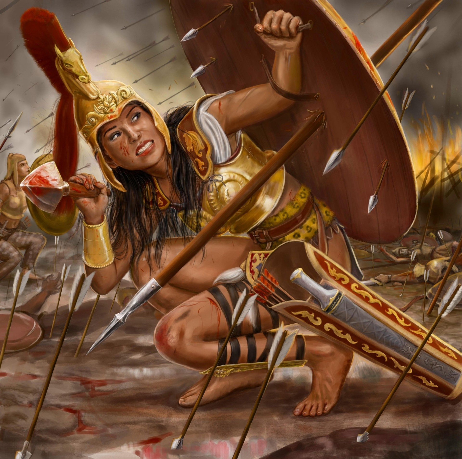 Девушка амазонка со щитом и копьем на ветру стоит на горе около статуи