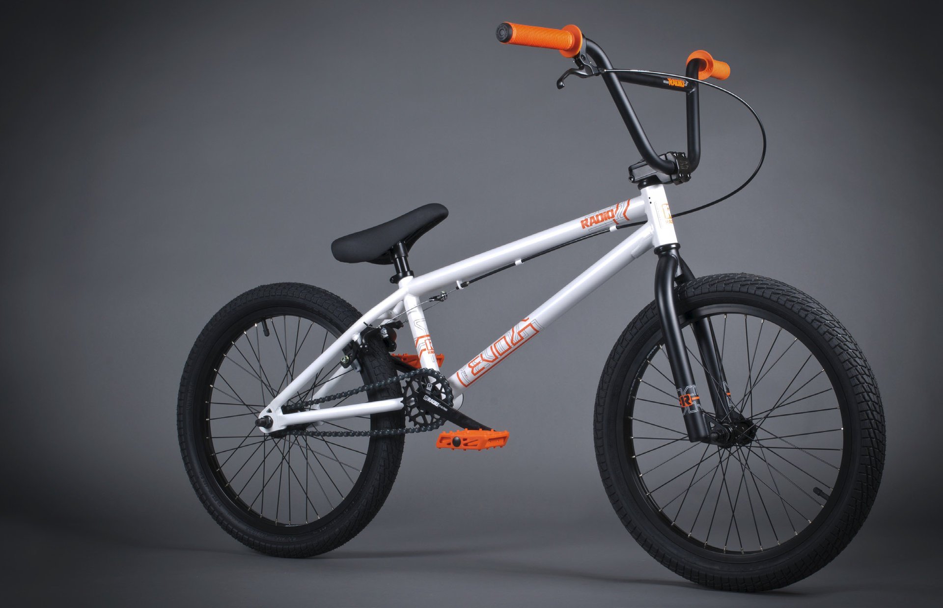 Белый с оранжевыми ручками bmx велосипед на сером фоне