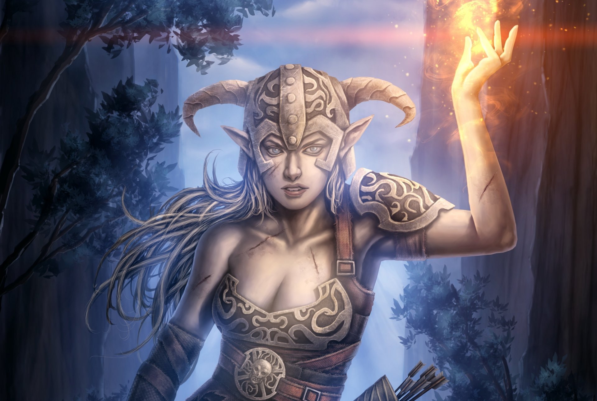 Между гор девушка в шлеме с рогами держит в руке огонь