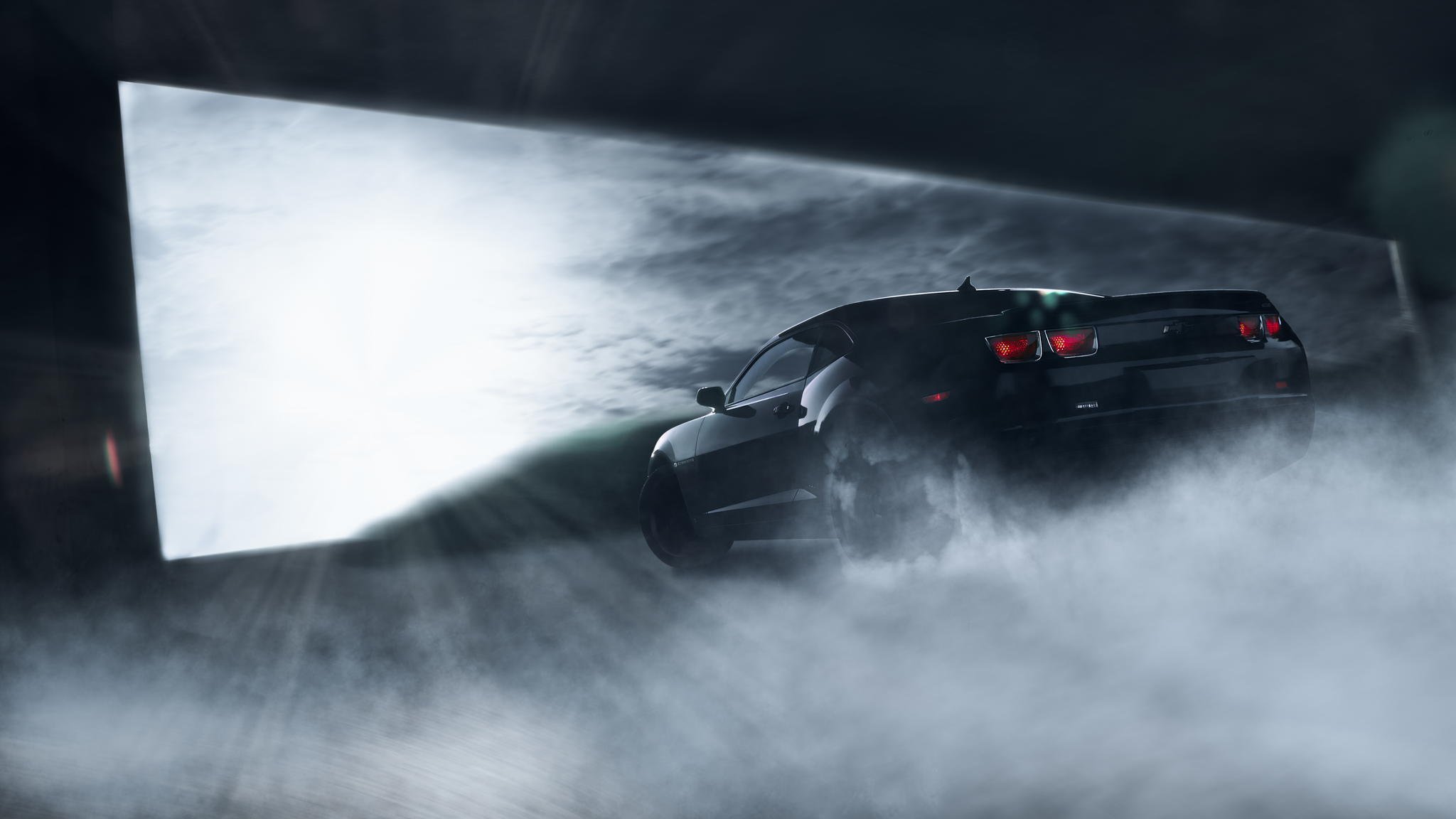 Черная chevrolet, camaro, ss в темноте и в дыму вид сзади